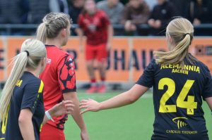 Begleitet und unterstützt von Einlaufmädchen aus den eigenen Nachwuchsmannschaften trafen die Damen des FC Eschweiler am Tag der Deutschen Einheit