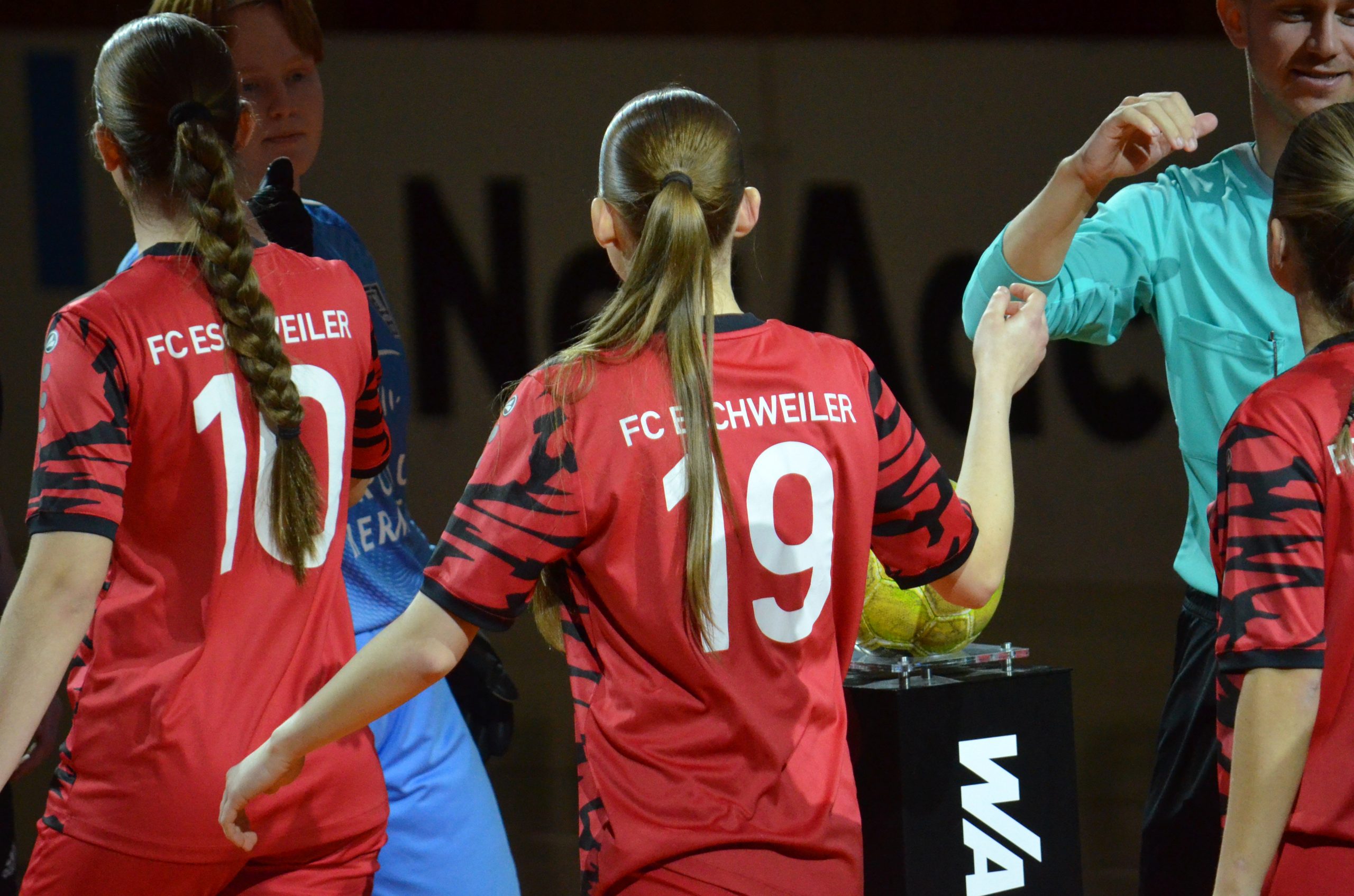 Beflügelt vom Gewinn der Eschweiler Stadtmeisterschaft einen Tag vorher, zeigten die Indelöwinnen in ihrem ersten Spiel gegen den TuS 08 Jüngersdorf eine starke und sehr konzentrierte Leistung. Belohnt wurde der couragierte Auftritt gegen die zwei Klassen höher spielenden Gegnerinnen mit einem verdienten 3:1-Erfolg. Die Treffer erzielten Lolle Mingers (3.), Top-Torjägerin des Qualifikationsturnieres, sowie die Zwillingsschwestern Anna (7.) und Nikola Katzenbach (12.), die beide noch im Kader der B1-Juniorinnen stehen. Nachdem sich die FCE-Frauen den Vorjahressiegerinnen des SV Waldenrath/Straeten in der zweiten Begegnung mit 0:4 geschlagen geben mussten, fiel die Entscheidung um das Weiterkommen ins Halbfinale schließlich im letzten Gruppenspiel gegen den Burtscheider TV. Den Aachener Landesligistinnen gelang nach drei Treffern in drei Minuten (5., 6., 8.) die frühe Vorentscheidung und am Ende (4:0) auch als Gruppenerste der verdiente Einzug in die Vorschlussrunde. Hier setzte sich der BTV gegen Alemannia Straß durch (3:2), musste im Endspiel dann aber eine 4:6-Niederlage gegen Top-Favorit Alemannia Aachen hinnehmen. Für die Damen des FC Eschweiler bleibt die wertvolle Erfahrung der Endrundenteilnahme und die Erkenntnis, dass sie klassenhöheren Teams durchaus Paroli bieten können.