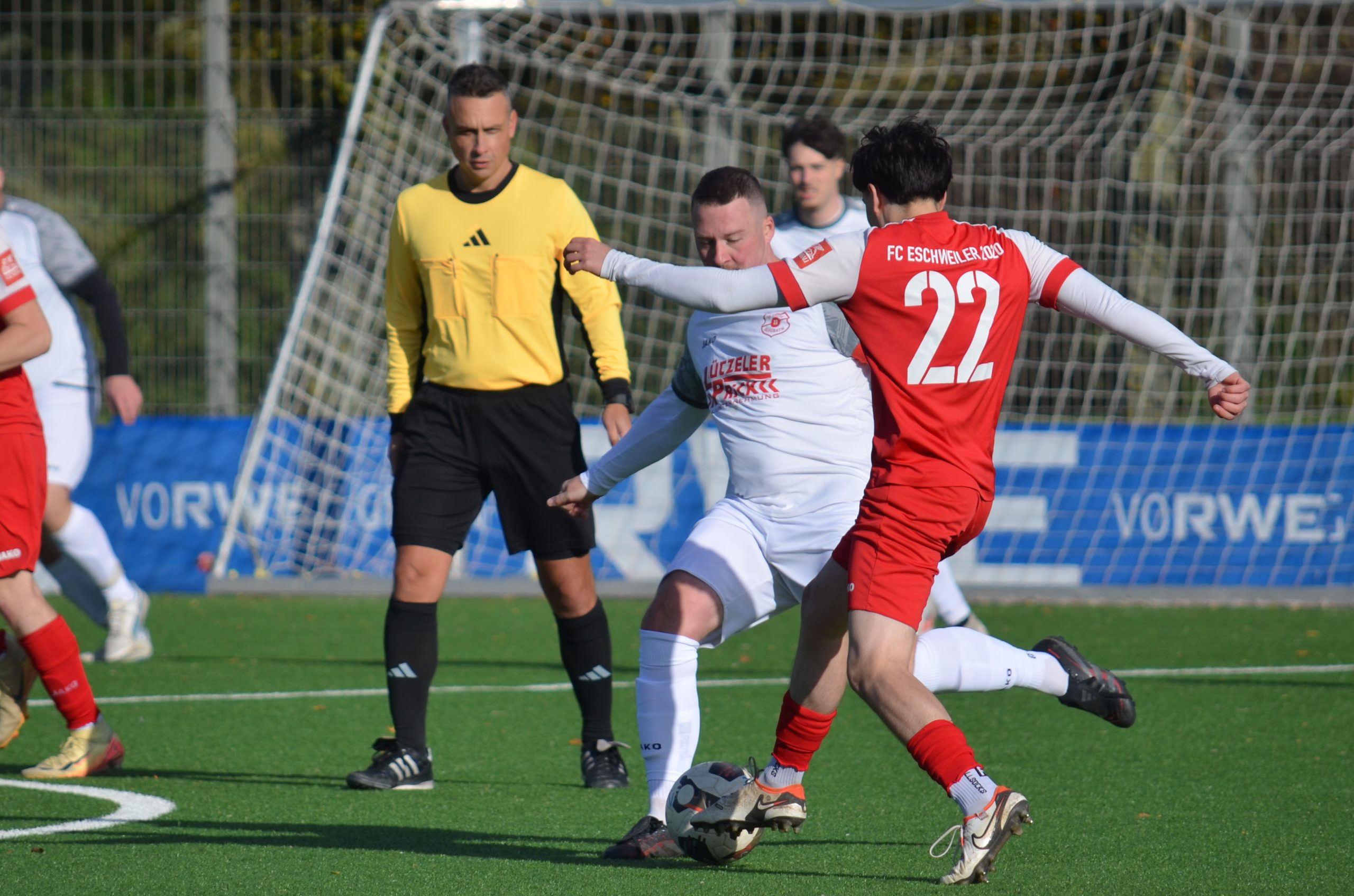 Nach der ersten Saisonniederlage am vorletzten Wochenende (0:2 gegen Eintracht Warden) wollte die zweite Mannschaft des FC Eschweiler unbedingt wieder zurück in die Erfolgsspur. Und tatsächlich zeigten sich die Gastgeber entschlossen und ausgesprochen treffsicher – allen voran Etienne Burlet, der vier Tore zum deutlichen 7:1 gegen Bergrath beitragen konnte. Das Team von Tobi Wirtz bleibt damit auf Platz eins, stellt mit einem Schnitt von über vier Toren die beste Offensive der Liga und rangiert auch bei der Anzahl der Gegentore unter den Top 3. Allerdings habe die beiden engsten Verfolger beide noch ein Spiel weniger. Am kommenden Sonntag kommt es dann zum direkten Duell beim Tabellenzweiten SC Kellersberg II.